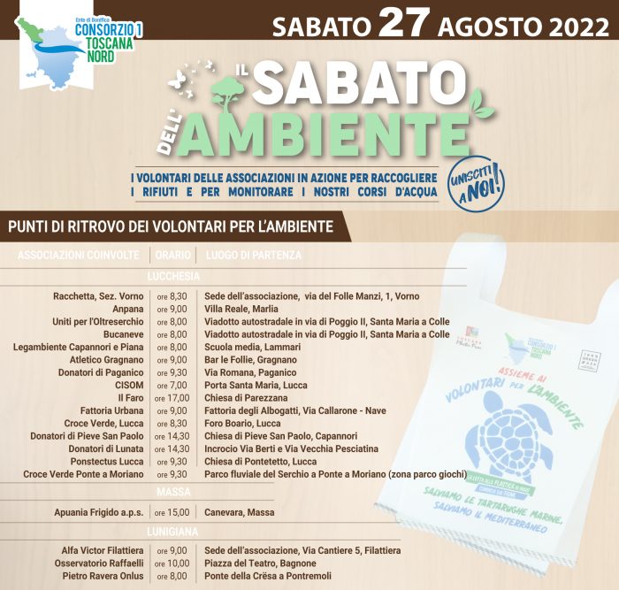 Sabato 27 agosto torna il Sabato dell’Ambiente, l’appuntamento mensile di pulizia dei corsi d’acqua promosso dal Consorzio 1 Toscana Nord insieme alle associazioni dei territori, alle amministrazioni comunali ed alle aziende di rimozione rifiuti.